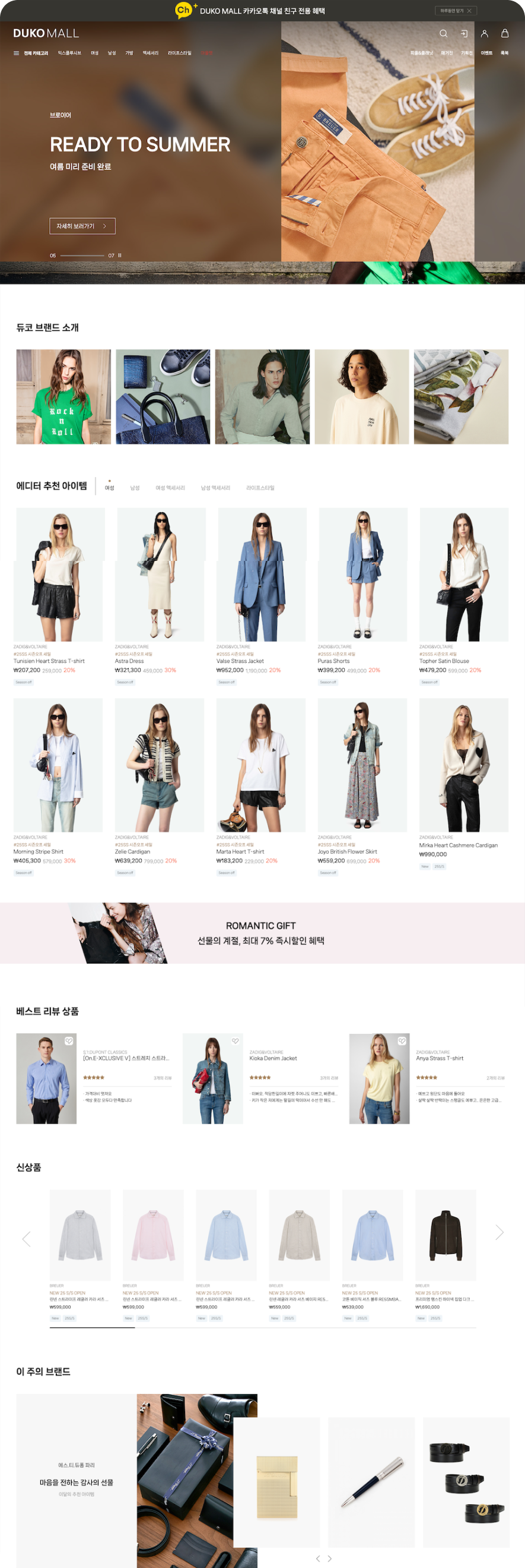 SJ 듀코몰은 듀퐁, 쟈딕앤볼테르 등 프리미엄 브랜드의 공식 수입사 SJ 그룹이 운영하는 온라인 쇼핑몰로, 정품만을 취급하며 고급스러운 브랜드 경험을 제공합니다. 브랜드별 UI/UX, 통합 멤버십, A/S 보장 등 프리미엄 쇼핑 환경을 구축했고, 오프라인 매장과 연계된 옴니채널 서비스도 지원합니다.