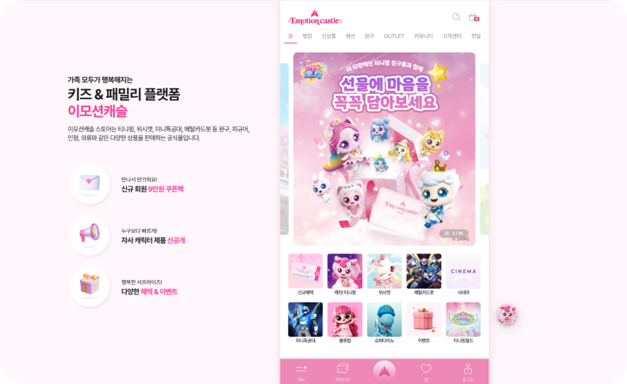 이모션 캐슬 쇼핑몰은 테마파크를 더욱 편리하게 즐길 수 있도록 설계된 공식 온라인 플랫폼입니다. 이모션 캐슬에서는 방문 전 티켓 예매는 물론, 현장에서 줄 서지 않고 이용할 수 있는 대기 신청 기능, 그리고 다양한 매장 정보를 쉽게 확인할 수 있는 매장 안내 서비스까지 제공되어, 방문객의 편의성과 만족도를 높였습니다. 모바일과 PC 어디서든 손쉽게 접근 가능하며, 테마파크 이용 전부터 이용 중, 그리고 이용 후까지 원스톱으로 관리할 수 있는 통합 서비스를 제공합니다.